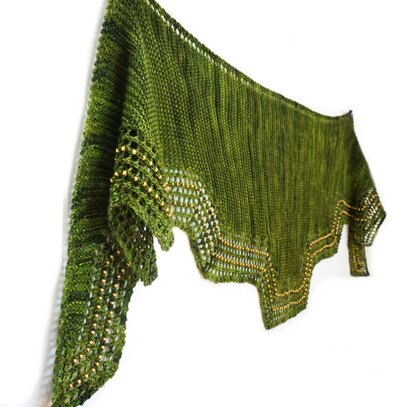This shawl is worked side-to-side from one tip to the opposite tip. It increases in steps, or tiers, to the center, and then decreases the same way. A garter stitch body forms at the top of the shawl while a lace edge runs along the bottom. Instructions are included to make two sizes of this pattern, a smaller, one-skein shawlette or a larger shawl.