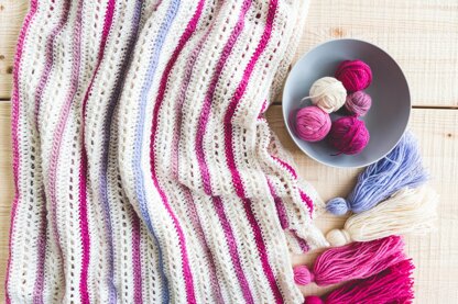 Crochet this simple lacy blanket with self-striping contrast stripes made from cake yarn! Easy eyelet stitches and decorative tassels give this blanket the luxe look without complicated instructions.