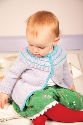 The cardigan is worked seamlessly from the collar down. Its yoke begins with an i-cord and is shaped with simple increases. Once the sleeves and body are completed, the buttonhole band is worked in a contrasting colour i-cord.