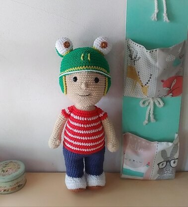 El muñeco Caleb junto con su gorrito mide 35 cm aproximadamente, eso va a depender de que hilo y aguja utilices y de tu tensión.