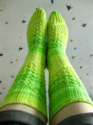This pattern is dedicated to „Calianna“ a character from „Critical Role“. This young and excitable sorceress is of elf decent but got got a bit of draconic blood on one side, the right side to be precise. Her signature look are her green hair with ribbons, which she uses to mask the dragon scales and yellow eye on her right side of her face. To mask the draconic hand she is mostly seen wearing flowy and wide robes. The sock pattern is remarkable in this aspect, that it combines the unexpected and strange with the elegant and known. An easy 2x2 rib pattern are broken up by shards of lace. The lace pattern is a reminisce of Caliannas draconic heritage and the rib pattern is trying to cover it up, but still flashes of the scales show through.