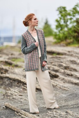 Notions: Waste yarn for markers, markers (removable) and yarn needle. Crochet hook or sewing machine or 3-pronged plus 5-pronged felting needle with brush/platform (see video) for steeks and if preferred 1 m/1 yd bias binding to cover steek at armhole. 9 (15 mm/5/8”) buttons.