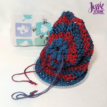 This pattern can be found for free online at jessieathome dot com/pattern/knit-camping-shower-bag/