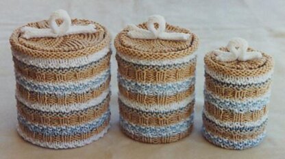 A delicate stitch pattern to knit for Sleeves that fit over coffee cans! This is an easy pattern as well as the top cover. Cover is knit circular, and then knit a bow for handle for top. To lift, just pick up top of bow to lift off lid! Your neighbors will want a set of these, after they see yours! If you do not drink coffee, have friends and neighbors save the cans for you. Save the plastic tops too, you will need them to complete this set. Uses worsted weight yarns and knitting needles, US # 10.