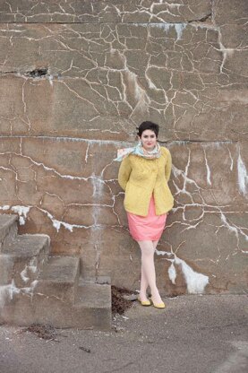 Canby is a jacket with overlapping, double breasted fronts and a skirted bottom.The top is worked from the top down, the bottom from the bottom up, then the two pieces are joined using a three needle bind off.The bulky gauge of the yarn and the added pockets will keep you warm and cosy.