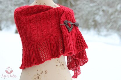 Combining cable and lace stitches is always an exciting adventure for me. This shawl features a decorative cable and rib body and a border that catches the eye instantly. The cables of the body are like small brooks flowing into a river, they twist and turn until they become one of the defining elements of the border. These big cables are separated by a mesh texture with a touch of floral folk art.