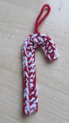 This is a very quick crochet. Using 2 strands of yarn to crochet with, this pattern makes a simple, eye-catching candy cane decoration. To prevent curling, felt is glued or sewn to the back of the decoration.
