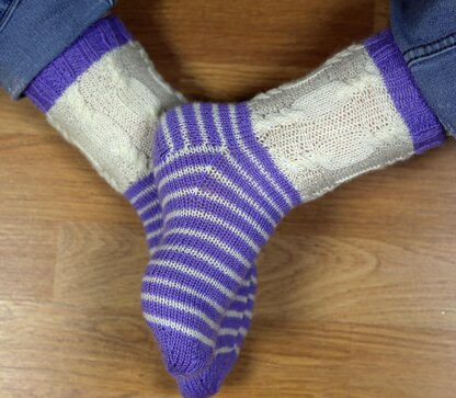 Diese halblangen Socken, vom Bündchen zur Spitze gestrickt, geben dir das Gefühl, wieder ein Kind im Süssigkeitenladen zu sein! Die kleine Schwester ist noch nicht ganz bereit für Jacquardmuster und die Form-gebung, die für Kniesocken nötig ist, aber sie kann es nicht erwarten, süsse Zöpfe und Streifen auszuprobieren, jede Menge Spass und eine Chance, mit Farben zu spielen. Diese Leckerei hat nichtmal Kalorien! Versuch ein selbst-streifendes Garn, entweder als einzige Farbe oder als Kontrastfarbe.