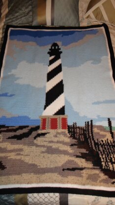 I created this afghan for my husband who had served in the U.S. Navy at Cape Hatteras. I used a post card image and created it through PC Stitch, eliminating parts to make a simple pattern. My husband displays HIS afghan on our quilt rack. It can also be used as a wall hanging or a throw. It is warm. This pattern is done in graph style. It is easier to copy the graph, then tape the copies together before crocheting. Then you have your original still in tact.