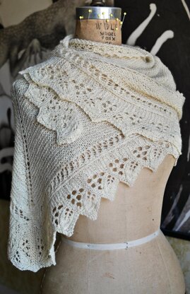 Finished Size: 22(26, 31) inches long and 52(60, 72) inches across top edge (stretched and blocked)Yarn Requirements: 650(850, 1200) yardsGauge: 21 sts and 48 rows = 4 inches in garter stitch on larger needlesNeedles: size 6US (4.0 mm) circular for body (or size to obtain correct gauge)