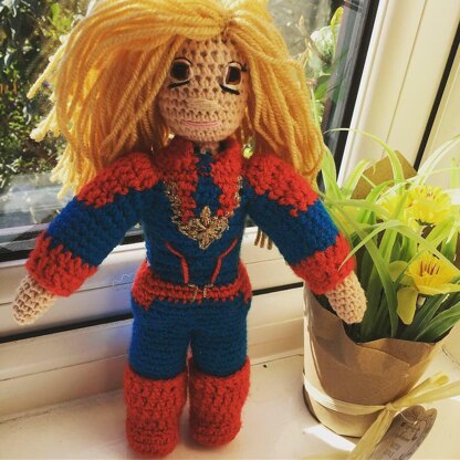 With this pattern you will be instructed on how to make an Amigurumi doll and Captain Marvel Outfit. The instructions also show you how to embroider eyes; this will require embroidery thread.