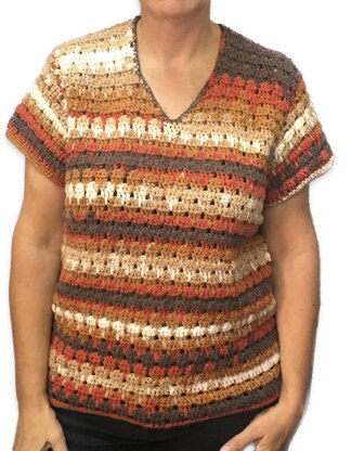 Narrow neck t-shirt style top using 3 colour striped yarn resulting in a retro feel which goes great with denim or a A-line skirt.