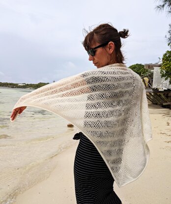 This unfussy, modern take on a lace shawl is finished with a casual, curling edge of plain stockinette, inspired by the easy-going attitude of the tropical island where it was designed.