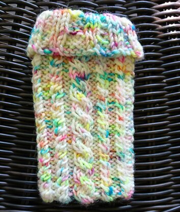 Worked in the round from the base to the top, you can work the holder to your desired length. A great small project for using up leftover fingering weight yarns and practising cables.