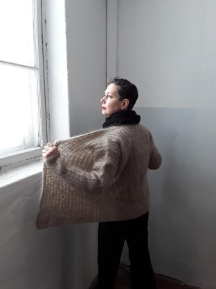 It is a simple oversized cardigan in half-brioche stitch. Seamless, top down, try on as you go. If you are substituting yarn, try combining several threads of lightweight mohair or combine mohair with wool, anything that gives you 50 g/100-120 m. The pattern contains photo tutorial of the collar construction. On social media, please add tags #annaknittingdesign and #cardiganno1