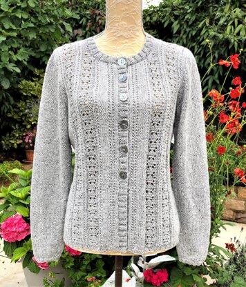 A very pretty, classic cardigan worked in a super recycled yarn. The vertical bands of the eyelet panels are worked in reverse stocking stitch. Worked bottom up with full, easy to follow, written instructions.