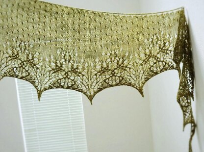• Shawl is knitted from top edge down, starting with plain stockinette stitch, and followed by lace border.