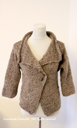 Caribou wrap is full of sumptuous texture and cosy comfort.. Open front allowing versatile closure. Features alternating bands or stockinette and reverse stockinette stitch for a textured look, 3/4 sleeve length. Simply charming!