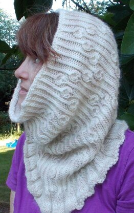 A ruffle that flares out over the shoulders leads into a series of “bells” on twist-stitch bellropes in an attractive arrangement somewhat reminiscent of Austrian ski sweaters. This cowl can be worn pulled up over the head for maximum warmth, or just around the neck.