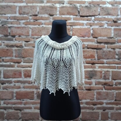 Caroline’s cape is one piece cowl and cape which is worked in the round. The pattern is adjustable in size. The width can be easily adjusted by adding the number of cast on stitches in multiple of 8 stitches, while the length can be adjusted by adding more knit rounds between lace increase rounds (between rounds 39 – 44, 44 – 49, and so on).