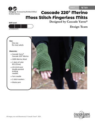 Cascade 220 Merino Moss Stitch Fingerless Mitts in Cascade Yarns - W789 - Downloadable PDF is a free Intermediate Knitting pattern by Cascade Yarns, available as a Downloadable PDF and includes instructions in English. Super fun to make, this pattern could be your next masterpiece!