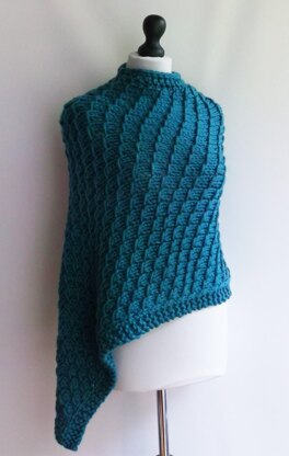 Bulky weight textured poncho which knits up really quickly. One side seam and an i-cord finish on the neckline.