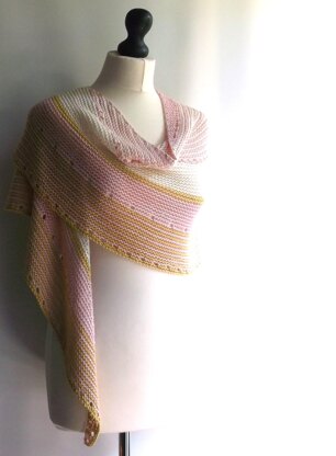 This cotton shawl has a generous wingspan, stripes, color blocks and eyelet increases. Garter stitch throughout, makes a simple knit, suitable for a confident beginner plus!