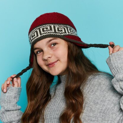The earflaps are both worked first, then stitches are cast on for the front and back of the cap, and joined to work in the round. The colorwork pattern is worked using larger needles, then the crown is worked in garter stitch using the main color and the smaller needles. After blocking the hat, an attached i-cord and braid are worked in contrast color.