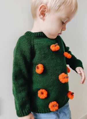 The sweater is knitted from the top down in the round. 3D pumpkins or ghosts are knitted seperately and sewn on after to create the fun seasonal jumper.