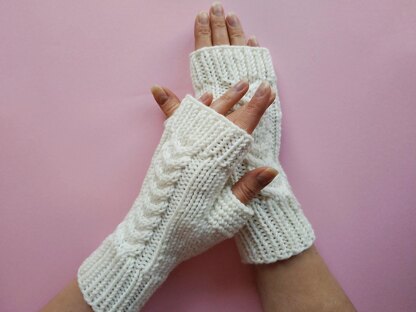 This is a quick and easy project, suitable for beginners. The gloves are worked in the round on short circular needles. The thumb is crocheted; this part of instructions can be omitted for thumb hole gloves. The pattern includes round-by-round written instructions for right and left gloves, and a photo tutorial for the following stitches: cables, make 1 right and make 1 left stitches.