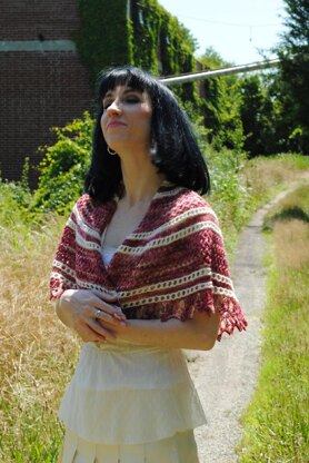 A delightful open and airy half -Pi shawl worked in the traditional manner. A knitted on border does double duty as the bind off.