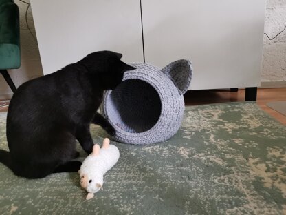 Crochet pattern for a lovely cosy cat cave with cat or mouse ears.