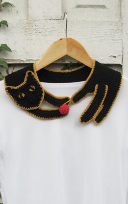 Collar is crocheted bottom-up with an applique added after the “body” part is finished. The ball/button is crocheted and stuffed with yarn/fabric/etc. Whole pattern is mostly single crochet stitches.