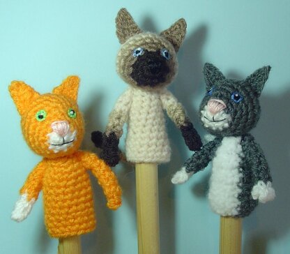 Three sweet little cats. Two different types of body, one worked in the round and the other flat in two colours. The siamese uses four different shades of cream through to dark brown but these were all left-overs so I don't have the details. The instructions for the siamese are slightly different to the two moggies because of its slender shape.. I used James C Brett Bubbalicious for the grey cat's tummy because it is so soft and I had some over from another prject but normal white DK will be fine if you don't have any.