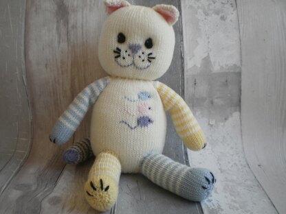 A colourful little cat toy to entertain all ages! He has striped legs, arms and tail, adorable big eyes and 3 cheeky little mouse motifs that are swiss darned at the end of the knitting. Why not change the colour scheme to create your own unique little feline friend?