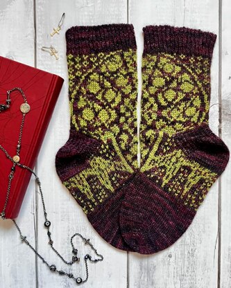 The motif of the Cathedral Socks shows a section of the North Rose of Reims. The other elements of the socks are inspired from typical Gothic architectural elements. Those of you with an architectural interest will also recognize the buttresses that “support” the arch of the foot in these socks and are typically found on the sides of churches.