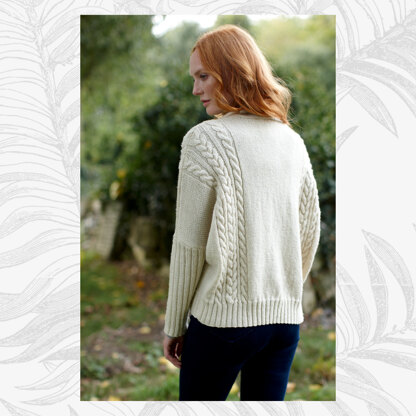 The batwing Catherine cardigan makes a dramatic statement with its mix of two cables on the body and a lovely scarf-like neck band featuring a bold, diagonal cable stitch. For a subtler impact, try knitting Catherine in a single colour.