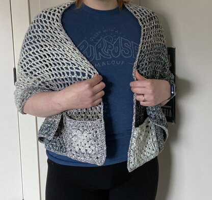 Anyways, My grandma moved to Washington and for her birthday I wanted to give her a cozy shawl for when she went and sat outside with my grandpa. Being from Utah I know our winters are pretty rough and our fall weather can be hit or miss and pretty chilly, so I figured it'd be similar if not colder up North, maybe leaning more toward Twilight Forks Weather but not quite. In the warmer months, it's a shawl with pockets, and in the colder months it can be used a scarf.