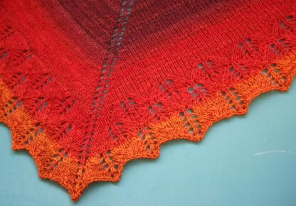 This elegant shawl works up beautifully in gradient-dyed yarn, or two coordinating colors. A slightly more than triangular shape keeps the shawl laying nicely on your shoulders, or wraps cozily around your neck. The lace edging is both charted and written, and creates a lovely scalloped border.
