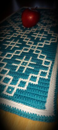 "Celeste" is the main color of this table runner and it means the celestial color, a symbol of communication through creativity, knows how to express loyalty and idealism, transmitting a sense of calmness that regulates the sleep-wake rhythm and favors diplomacy in general. Those who love it tend to have a harmonious behavior towards the environment and people. The pattern allows you to create any size of table runners, mug rug, section of a blanket, a rug, or other projects by adjusting the number of repeats in width and in height.