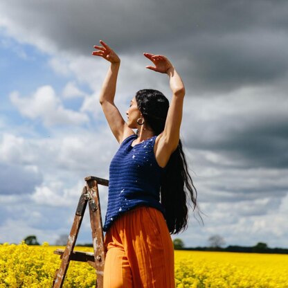 The vest is worked in the round for the most part, and is only seamed at the shoulders. It’s a quick and simple make, designed to be made in a cotton/viscose mix for the best drape possible. It’s a hip-length vest, ideal for layering but if you prefer a shorter fit, just remove rows before the upper body shaping.