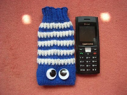 For the eyes you can either use "rolling" puppet eyes (buttons) or simple buttons or even felt leftovers in black and white and stitch them to the cellfish. (I recommend not to use eyes that you simply glue to the knitting, because they might not last very long)