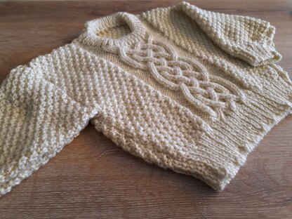 Aran style sweater with neat fold over neck. The main pattern is a double moss stitch with a 24 stitch Celtic Cable panel at centre front, giving a striking design without be overly fussy. Will suit either sex and is a perfect winter sweater. Will fit Age range from 3 years to 10 years and is a generous fit.