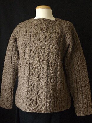 This pattern is one of the most popular of my career. Celtic Dreams is an Aran pullover knitted from the top down, featuring saddle shoulders and square armholes, Aran motifs and a deep skirt (as the traditional Aran ribbing is called). The cuffs fit loosely in keeping with the early Arans. The saddle shoulders are worked first and the live stitches are put on holders. The front and back stitches are picked up along the edges of the saddles, and the neckline stitches are cast on. The front and back are worked downward to the armhole, where stitches are cast on for the underarm. The garment is then joined circularly, and worked to the bottom of the skirt. The sleeves are picked up along the armhole edges, and worked back and forth for a few inches, then worked circularly to the cuffs.
