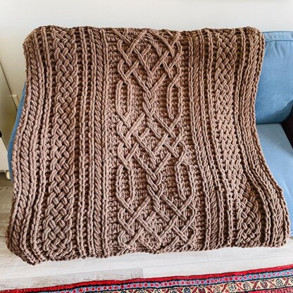 THIS IS A LOOP YARN FINGER-KNITTING PATTERN. The Celtic Harmony Throw Blanket pattern has a repeating pattern of Celtic cables and braided cable. This blanket is a smaller size, but the pattern can be repeated and skeins increased to increase the size.