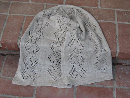 This pattern has two twist-stitch and lace panels on a knit background. The pattern was adapted from a Celtic panel that reminds me of hearts or perhaps a maze.
