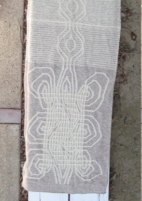 The pattern is for a rectangular shawl. The main design is a large (160 stitches by 232 rows), irregular, non-repeating Celtic knot worked as a cable. There is also a second, smaller (58 stitches by 63 rows) cable design.