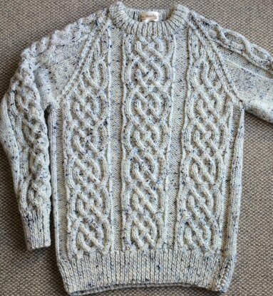 A gorgeous neat-fitting sweater with beautiful Celtic knot cabled panels. This design is a real eye catcher. Comfortable to wear with raglan armholes which also adds to the traditional look of this design.