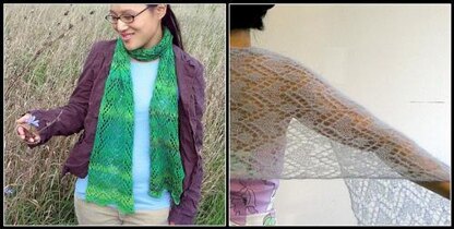 The pattern would look attractive in a variety of yarn weights and textures. The scarf version is knit in a 2ply fingering weight BFL handspun yarn on #8 needles. A list of commercial yarn substitutions is provided. The stole is knit in Madil Kid Seta.