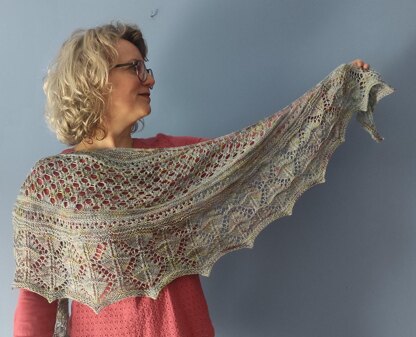 Lacería is a light and airy crescent shawl designed for, when in summer, you need to wear something not too thick. on your shoulders. The original shawl is knitted with 4 mm needles and a single skein of fingering thickness of 440 meters of Leicester quality, by Cazuelana (Alpacana) in Stonehenge color and has a lot of lace work to make you get the feeling of lightness. Its name is due to the fact that its final look reminds of the Almohade-style lacquerwork that decorates the Giralda Tower in Seville, as it was designed expressly for the Sevilla Teje festival in its 2024 edition. The pattern includes charts and written explanations.